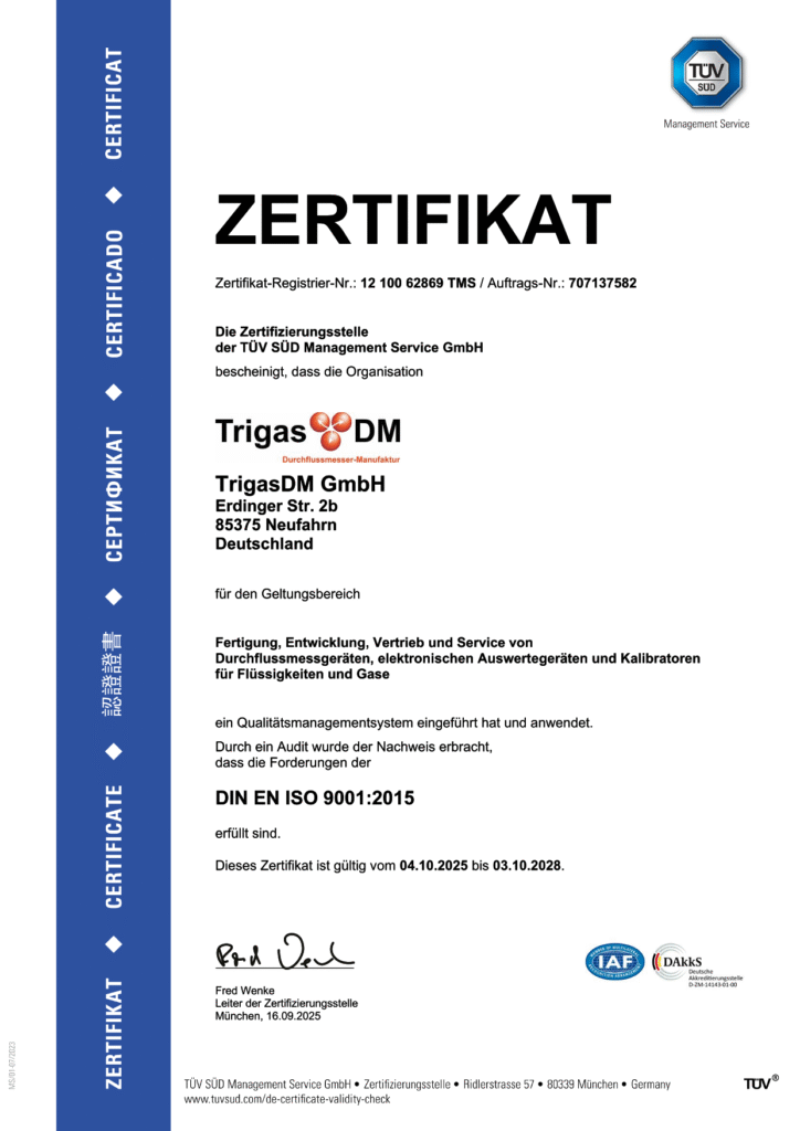 TrigasDM verpflichtet sich Dienstleistungen und Produkte zu liefern, die die Erwartungen und Vorgaben unserer Kunden erfüllen. Dazu betreiben wir ein zertifiziertes Qualitätsmanagement nach ISO 9001.